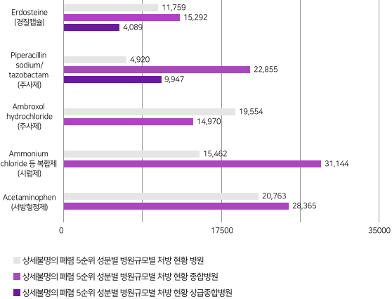 *분석기간 동안 ‘상세불명의 폐렴’(진단코드:J189)으로 처방된 다빈도 상위 5개 약품의 의료기관 종별 사용 분포입니다.